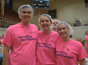Lauren Ryan (center) volunteers at the 2019 Maine Day Meal Packout along with Alec Penn (left) and Emma Hutchinson (right).