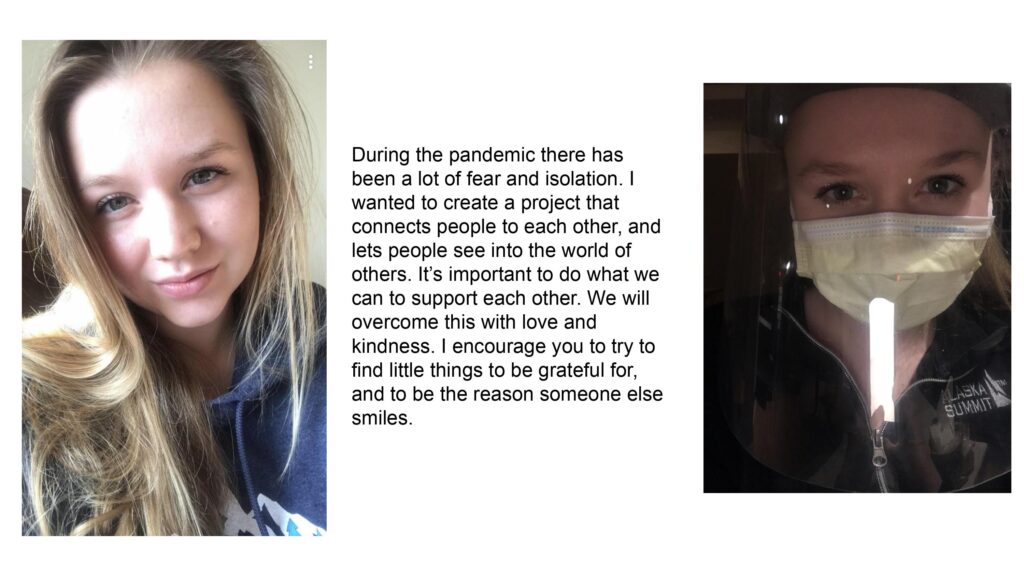 EK: Really I just want people to hear some other perspectives of the pandemic. and to see that we are all in it together. I know that’s a cheesy saying, but after hearing stories from all over the US and the world that is the one thing I have found to be true. I also think it’s important to highlight that although the pandemic has significantly changed our lives, and we have lost so many people, good can still be found. I never would have taken this class had it not been for the pandemic. I hope that it sparks more understanding and kindness.