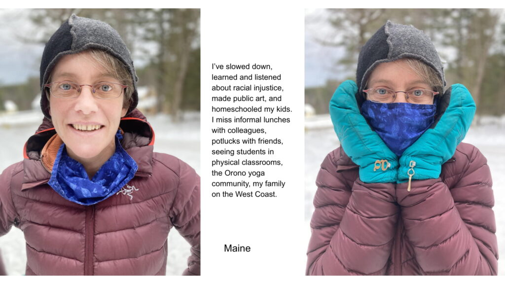 The idea of the masked and unmasked pictures came from a conversation I had with Professor Quirk. I mentioned that I started working at my job during the pandemic, so I have gotten to know my coworkers all with masks. Then when I see them eating (socially distanced), or I get a Facebook request from one of them, I often find myself so surprised to see their face. Professor Quirk and I talked about making little cards with masked and unmasked pictures, or a collage of these pictures, and over time it developed to my current project.
